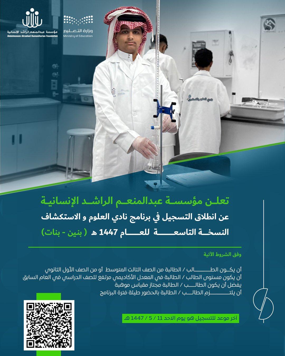 02 Nov The Abdulmonem Al-Rashed Humanitarian Foundation, in partnership with the General Administration of Education in Al-Ahsa, is preparing to launch registration for the ninth edition of the Science and Exploration Club. The program is open to male and female high school students, as well as third intermediate grade students, offering enriching intensive tracks and unique scientific experiments. 📲 Registration is available through the attached QR code More
