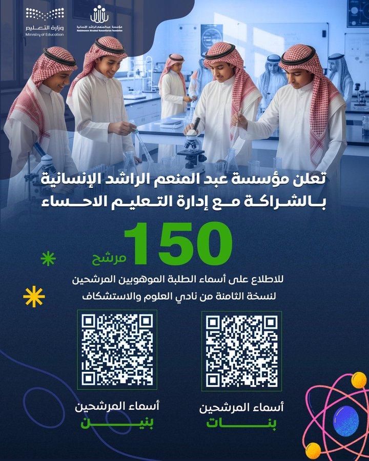 28 Sep In a strategic partnership between the Abdulmonem Al-Rashed Humanitarian Foundation and Al-Ahsa Education Directorate, we are pleased to announce the nominees for the 8th edition of the Science and Exploration Club, which includes more than 150 of our talented sons and daughters. More