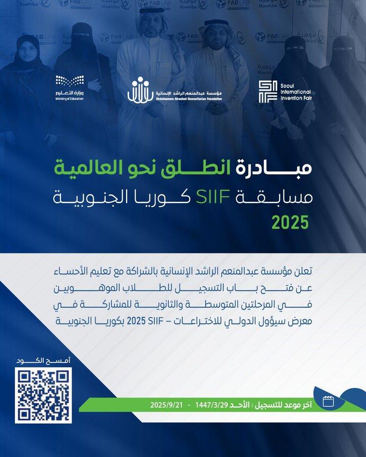 14 Sep تعلن مؤسسة عبدالمنعم الراشد الإنسانية بالشراكة مع تعليم الأحساء، عن فتح باب التسجيل في مبادرة "انطلق نحو العالمية" للمشاركة في معرض سيؤول الدولي للاختراعات (SIIF 2025) في كوريا الجنوبية. المزيد