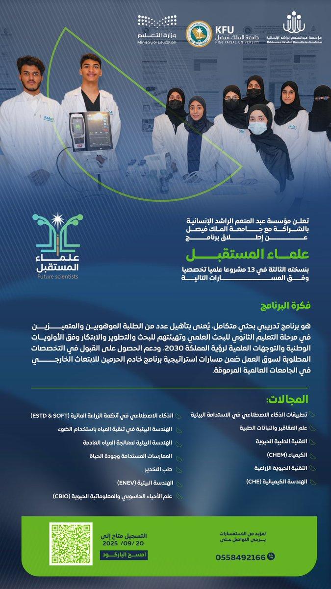 15 Sep تعلن مؤسسة عبدالمنعم الراشد الإنسانية بالشراكة مع جامعة الملك فيصل ممثلة بوكالة الجامعة للدراسات العليا والبحث العلمي عن إطلاق النسخة الثالثة من برنامج #علماء_المستقبل المزيد