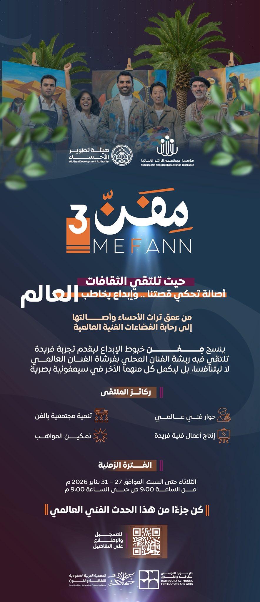 في تجسيدٍ حيٍّ للشراكات الاستراتيجية التي تُثري المشهد الثقافي، وتُعزز من مكانة الأحساء كوجهة عالمية للفنون، تتشرف #مؤسسة_عبدالمنعم_الراشد_الإنسانية بالتعاون مع شريكها الاستراتيجي #هيئة_تطوير_الأحساء بالإعلان عن انطلاق التسجيل للنسخة الثالثة من ملتقى مِفّن الدولي. ندعو الفنانين والشغوفين بالفن في كل مكان من حول العالم للانضمام إلى مِفّن، والمساهمة في إثراء الحوار الفني العالمي برؤاهم الفريدة انضموا إلينا في ملتقى تتلاقى فيه الطموحات، وتتعمق فيه الروابط الإنسانية، ويُحتفى فيه بالفن كلغة مشتركة تُثري حوار الحضارات. ركائز الملتقى 🔸 حوار فني عالمي: نخلق مساحة للحوار الفني العميق بين فنانين من مختلف الثقافات. 🔸 بصمة إبداعية خالدة: نعمل مع الفنانين لإنتاج أعمال فنية أصيلة مستلهمة من روح الملتقى، بحيث لا تكون مجرد قطعة فنية، بل بصمة إبداعية تروي حكاية التقاء الثقافات على أرض الأحساء. 🔸 تنمية مجتمعية بالفن: نؤمن بدور الفن كأداة للتنمية المجتمعية، ونعمل على إشراك المجتمع المحلي وتفعيل دوره في الحراك الثقافي. كن جزءًا من هذا الحدث الفني العالمي 🔗 للتسجيل والاطلاع عبر الرابط